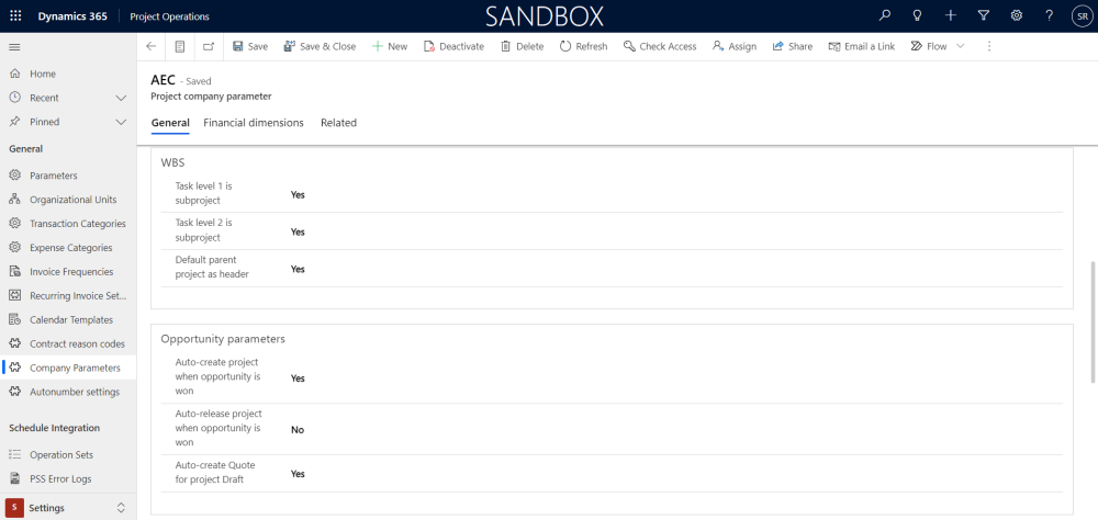 | Auto-release project when opportunity is won | If this parameter is set to Yes, then it will automatically release and sync projects to Finance and Operations. If this parametr is set to No, a button will be available at projects form to release. |