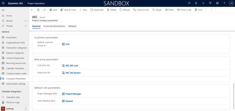 There is a new parameter form “Company parameters” introduced to configure default parameters for P-Project, WBS, Opportunity, Customer, Role prices and Default roles for specific legal entity.