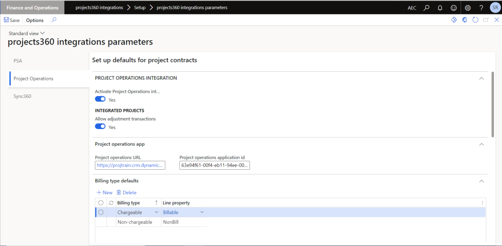 A new ‘Project Operations’ tab in ‘projects360 integration parameters’ form allows us to activate and configure Project Operations for a specific legal entity in Finance and Operations.