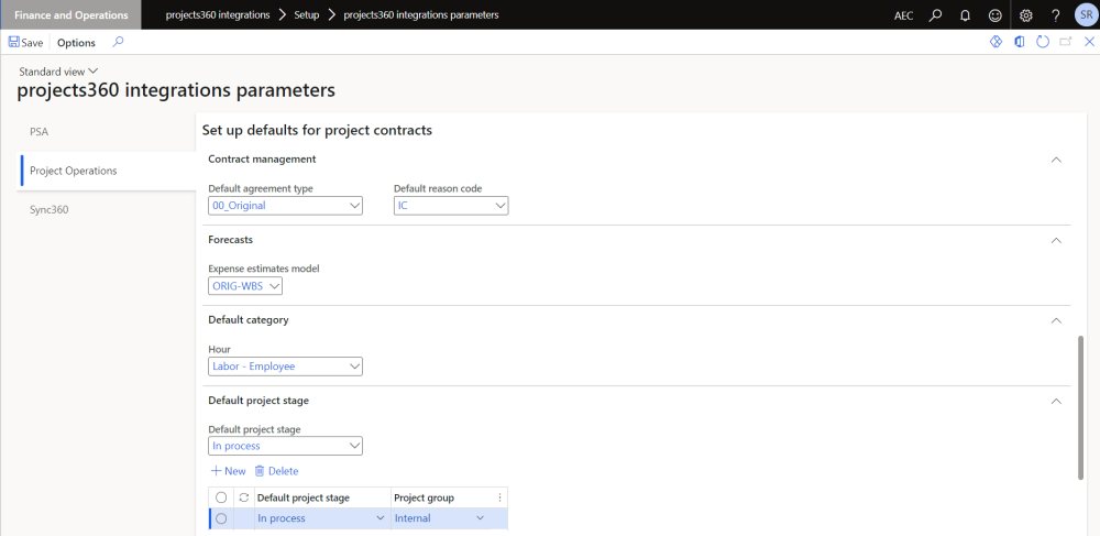 | Default agreement type | Allows to select contract agreement types which will be used as default value when the project contract line is integrated from Project Operations to Finance and Operations. |