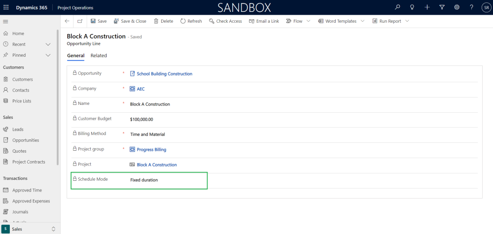 Opportunity lines form is enhanced by adding new field ‘Schedule Mode’. This field will default from the ‘Project Parameters’ and can be modified by the users at the Opportunity lines form depending on ‘Project Level Schedule Mode Override Permitted’ on the ‘Project Parameter’ form.