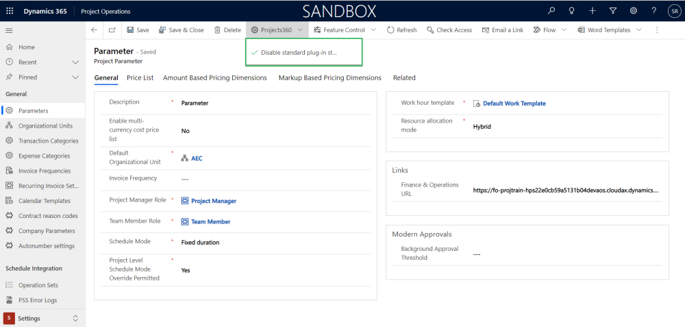 A new process/flow ‘Disable standard plug-in steps’ is added to disable necessary standard plug-ins in the ‘Project Parameters’ form.