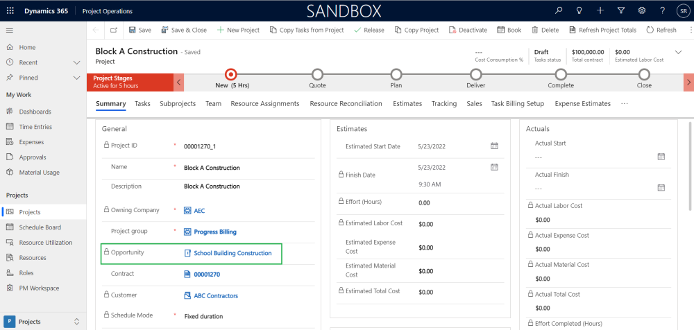 Projects form is enhanced by adding new field ‘Opportunity’ at Summary tab, which will allows the user to directly navigate to related Opportunity record in the Opportunity form when clicked on. This field is non-editable and populates with value when the project is created through opportunity management process.