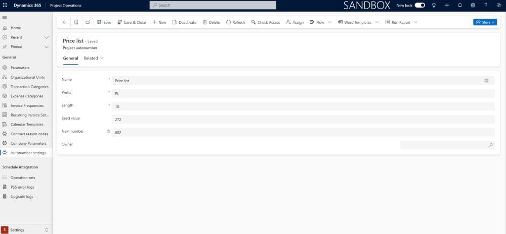 There is a new parameter form “Autonumber settings” introduced to configure number sequence format for “Price list”. This autonumbering will be used when the role based cost or sales prices synced between Finance and Operations and vice versa.