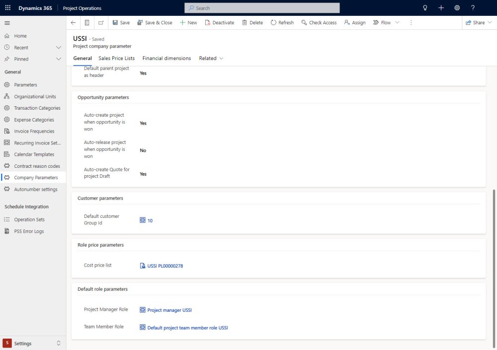 There is a new parameter form “Company parameters” introduced to configure default parameters for P-Project, WBS, Opportunity, Customer, Role prices and Default roles for specific legal entity.