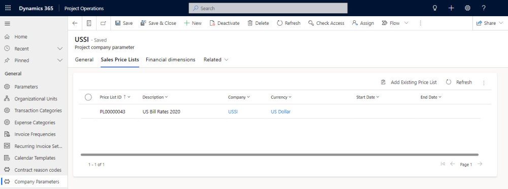 | Sales price lists | This tab enables the configuration of multiple default “Sales price lists” for each company. Sales price lists may vary over time, and different roles and prices are associated with different price lists. That’s why administrators have the privilege to add several Sales Price lists depending on the Legal Entity for which the Company Parameter is defined. These will serve as default Sales Price Lists for new Opportunities, Quotes, and Project contracts. |