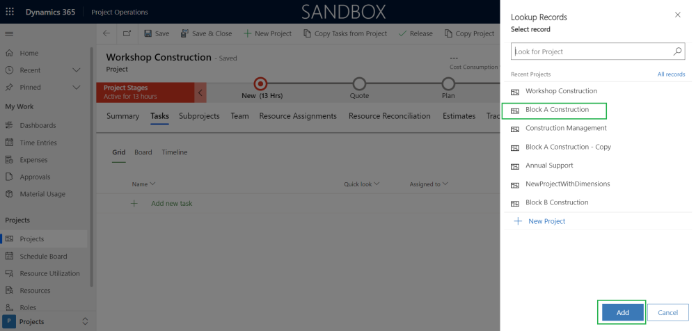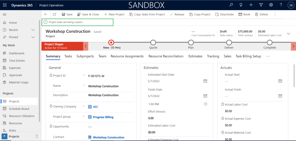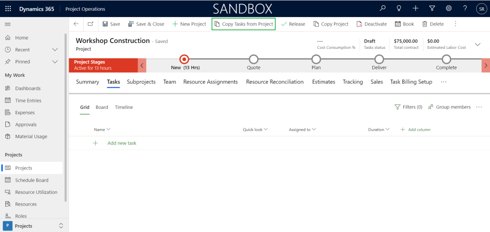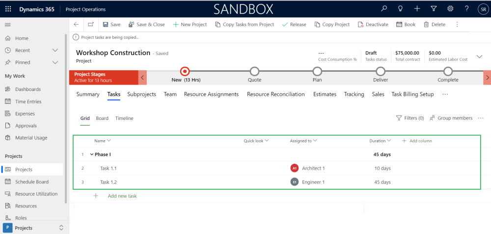 A new functionality added in Project Operations to copy tasks from the existing projects. This functionality will allow users to copy existing projects as templates. As part of this enhancement a new button ‘Copy Tasks from Project’ will be available when the project release status is still ‘Pending’.