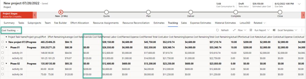 | Override Cost Rate | This field allows to override the average cost If a value is entered/updated then “Cost Remaining”, “Cost EAC” and “Estimated % Complete” will be updated as well |