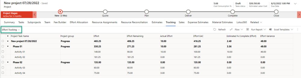 - “Effort tracking view” displays key information such as planned, actual and remaining effort as well as EAC and % Complete.