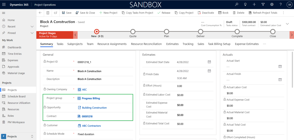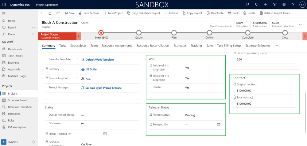 This section details out the various new fields and buttons added at Project level to enhance the functionalities. Users can create projects in Project Operations either manually or through opportunity management process. The new project will use a ‘Project ID’ based on the combination of ‘Opportunity Id’ + ‘_’ + Opportunity line number, for ex: if the ‘Opportunity Id’ value is ‘00001218’ and for the first opportunity line if we are applying either ‘Create project draft’ or ‘Close as Won’ then the value for field ‘Project ID’ for the newly created project will be ‘00001218_1’.