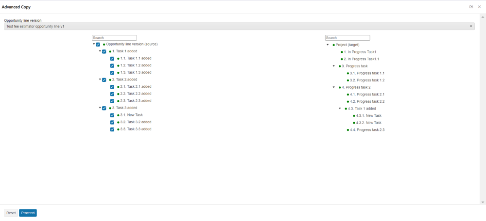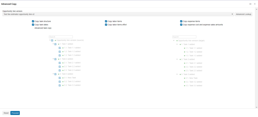 - The Advanced Copy feature allows users to create a new task structure from multiple estimate versions in the fee estimator. Users can easily drag and drop tasks from the source to the target area, ensuring that all related labor items, hours, and expenses are copied to the WBS.