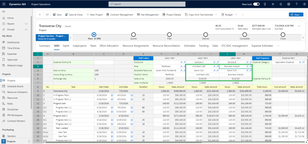 - The same resource assigned to different multiple roles in the WBS is also visible in Team Members, Effort Allocation, Resource Assignment, Resource Reconciliation, Estimates, and Bookable Resource Bookings within Project Operations.