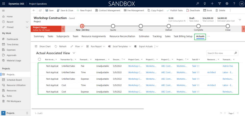 Recorded actual expense transactions from Finance and Operations are automatically reflected in Project Operations through dual-write synchronization. This process creates or updates two corresponding “Actual” transactions in Project Operations: one for “Cost” and another for “Revenue”.