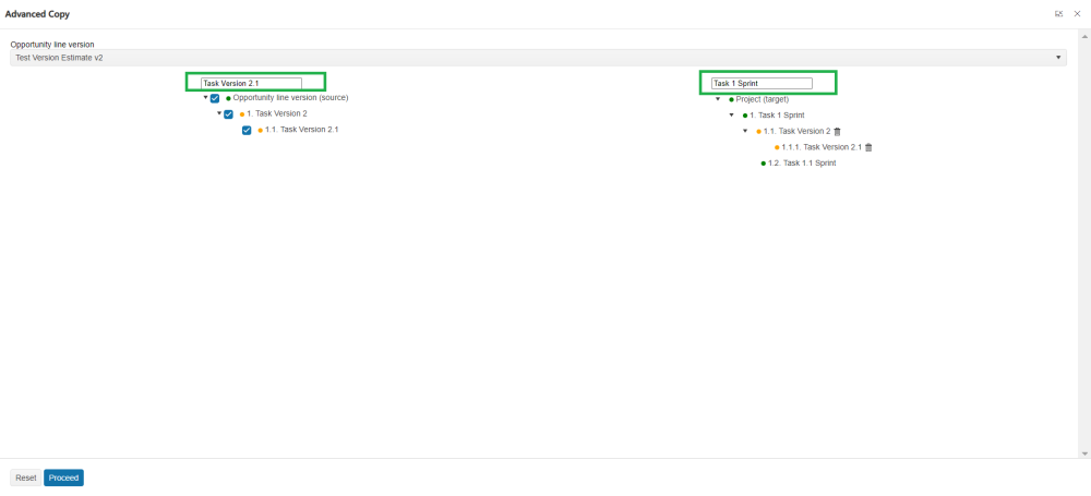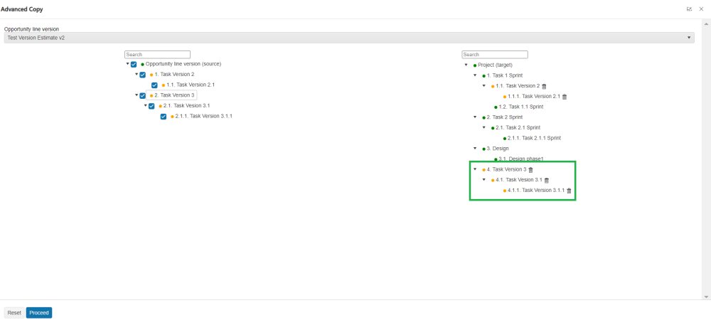 - Users can reset the entire task structure, which removes all tasks highlighted in yellow from the target area. This action restores the original schema of the task structure in both the source and target areas.