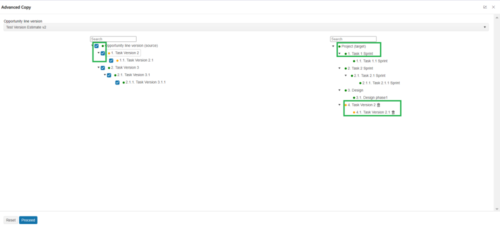 - The square box in front of each task and subtask in the source area allows users to easily select an entire hierarchy of the task structure for copying. When a task has multiple subtasks, users can simply check these boxes to select all related tasks and subtasks at once, enabling a seamless copying process of the entire task structure.