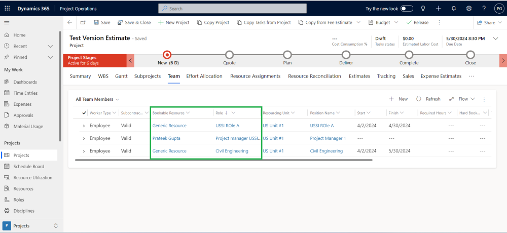 Copying Fee Estimates transfers the assigned roles and bookable resources while also triggering the allocation of hours based on the Start/End dates. However, it’s important to note that labor costs and sales prices are not copied; instead, they will be calculated based on the configured price lists.