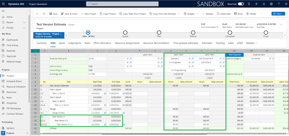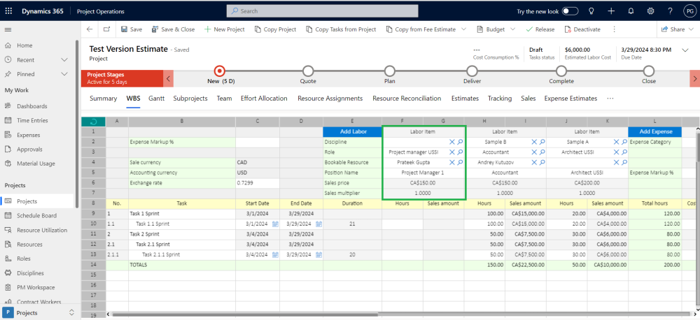 The Project Manager labor item will always be included in the Work Breakdown Structure (WBS) Planner, regardless of the version selected. Additionally, the selected version will have the Sales Currency and Accounting Currency fields set as non-editable. The Exchange Rate field, however, will remain editable and is copied from the selected estimate version.