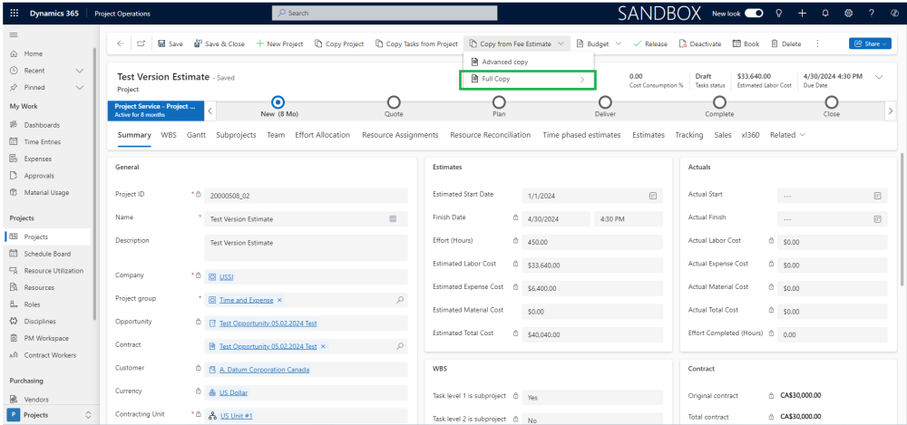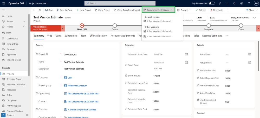 This new feature provides the ability to copy a “Fee Estimate Version” from the Opportunity Line to the Project.