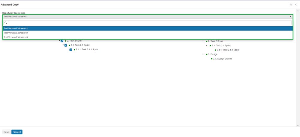 - Navigate to Projects > Open the desired project > In the Action Pane, select the Advanced Copy option from the Copy from Fee Estimator dropdown menu > From the Opportunity Line Version dropdown, choose the appropriate Fee Estimator version. from where you want to select the tasks.
