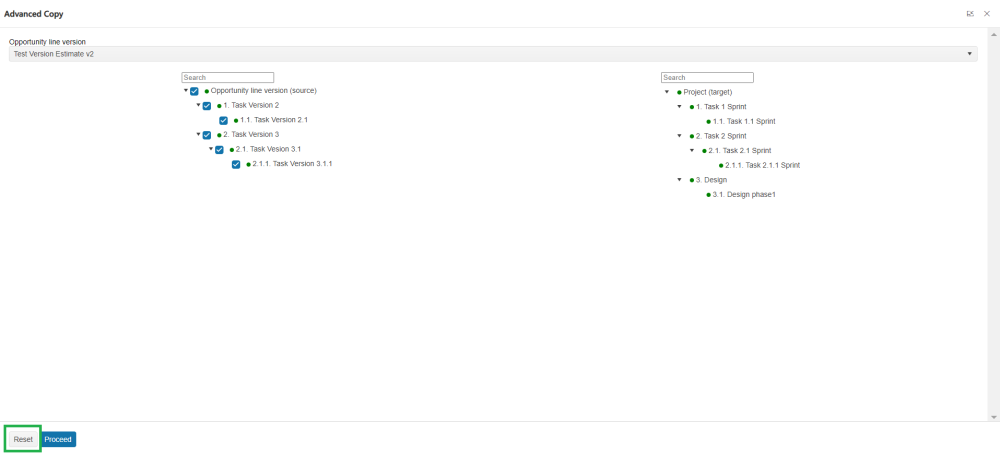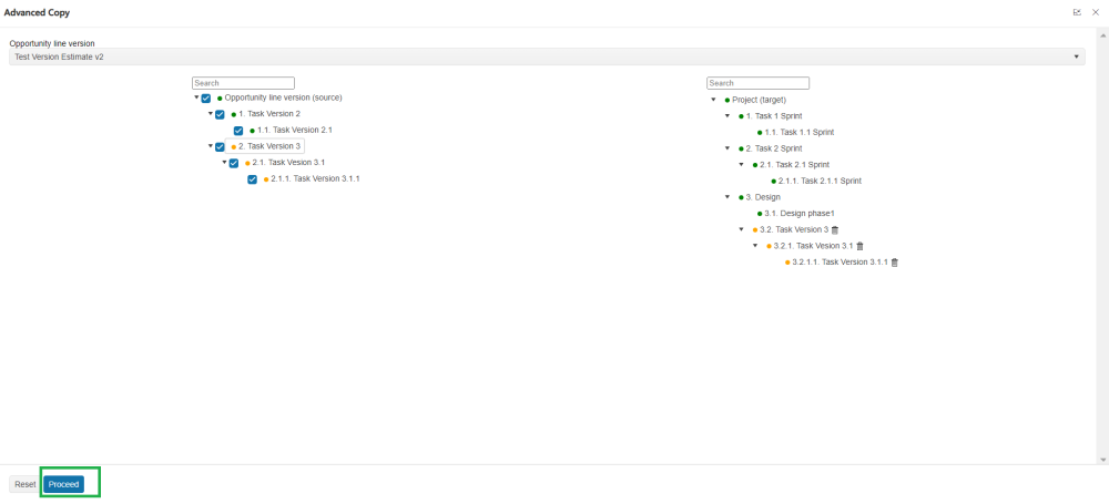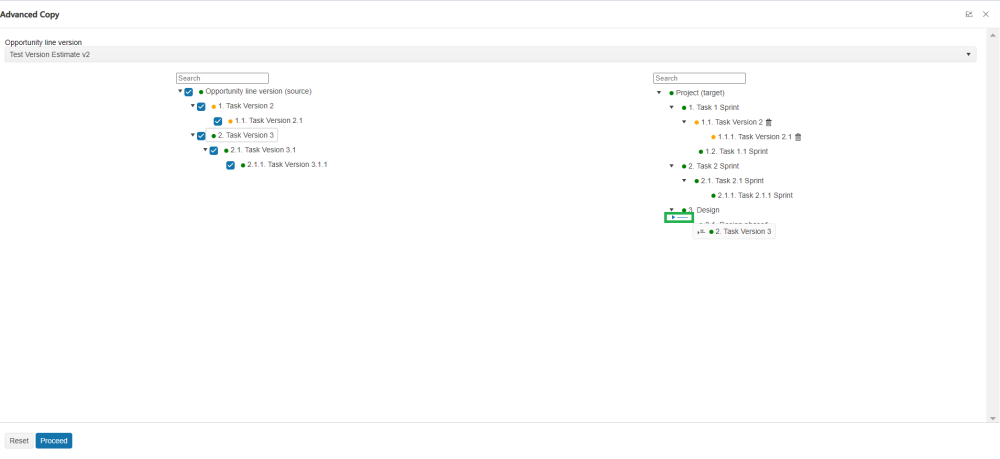 - Once the desired Opportunity line version is selected, users will see a comprehensive list of all tasks and their associated subtasks related to that estimate version in the source area. From there, tasks can be easily dragged and dropped directly into the target area.