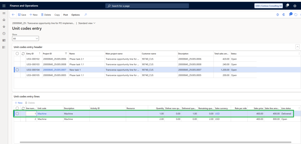 - If there is no existing Unit codes entry header with status “Open” for the given project or subproject (task), a new header record will be created in F&O; likewise, if there is no existing Unit codes entry lines record for the associated Project unit estimates record in Project Operations, a new line record will be created based on the Unit codes entry header.