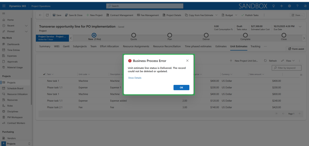 - If a ‘Unit Code Entry Line’ record has been fully delivered, then changes to the data in Project Operations (such as updating or deleting the unit estimate) are not allowed.