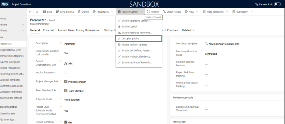 After enabling the “Cost Plus Pricing” parameter from the Project Parameters feature control, users will see an additional option in the Price Calculation field called “Markup over transaction cost.” This means that an additional markup will be added to the cost price of the role/resource, which will then be considered the sales price of that role/resource in xl360 templates.
