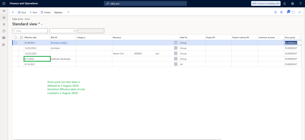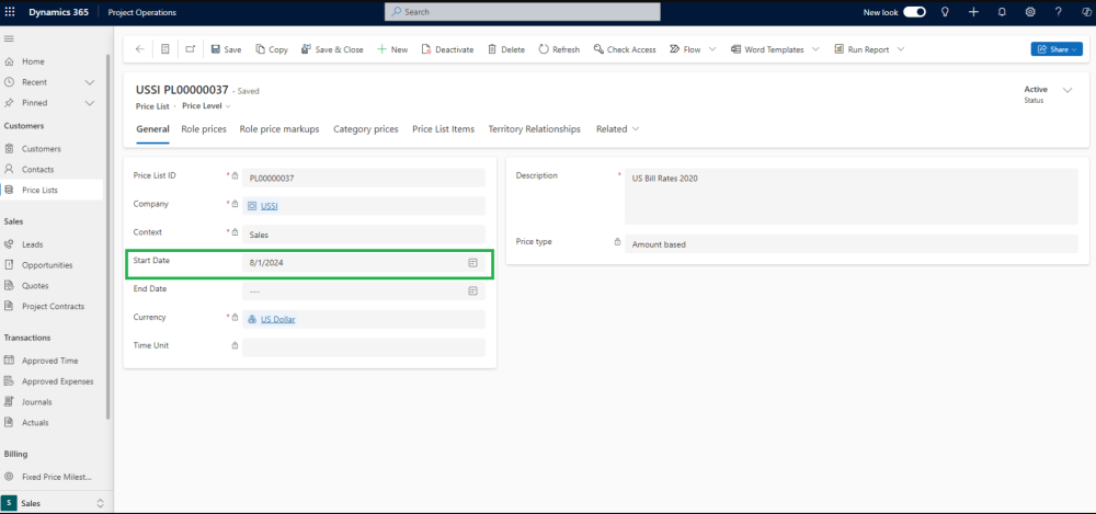 | Note – The effective date for the regular role price will use the start date from the sales price list. If a price list start date is specified, the regular role price in Project Operations will use that date when syncing with Finance and Operations. If no price list start date is set, then the effective date will default from the creation date in F&O. |