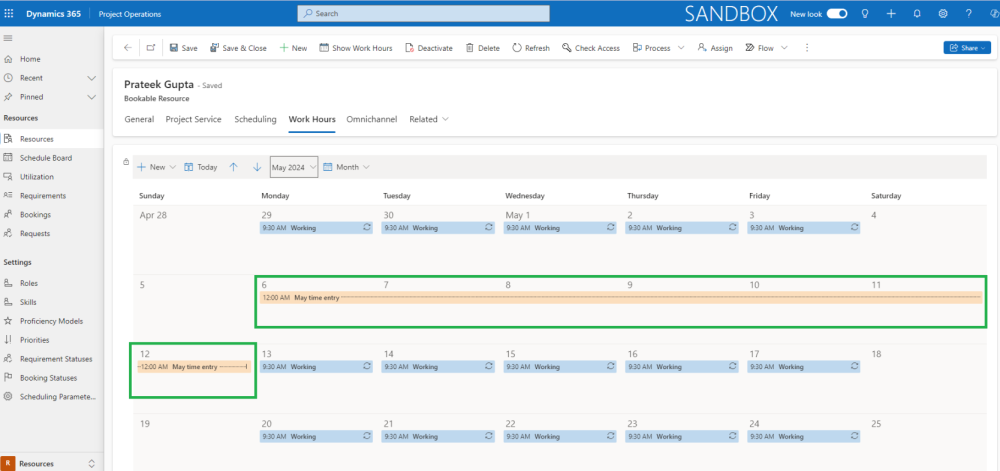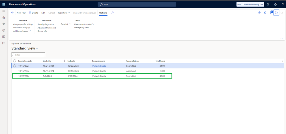 - If a PTO request is either Submitted or Approved in F&O for a project resource, it is sync to Project Operations by creating or updating the Time-off data for that Bookable Resource in the ‘Work Hour Calendar’ for the specified dates.