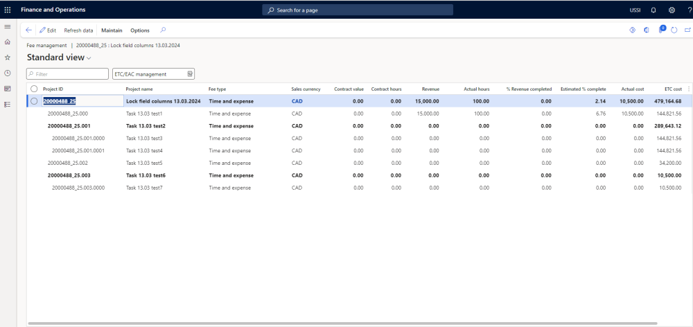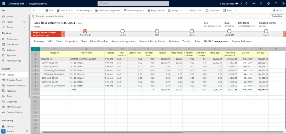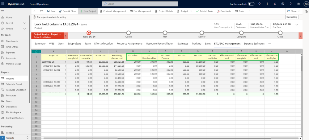 ETC/EAC Management involves keeping track of Estimated Time/Cost to Complete (ETC) and Estimated Time/Cost at Completion (EAC) during project management. This helps users manage the expected time and cost for completing tasks. The relevant data for ‘ETC/EAC management’ in F&O (Finance and Operations) is directly visible in the Project Operations Project form.