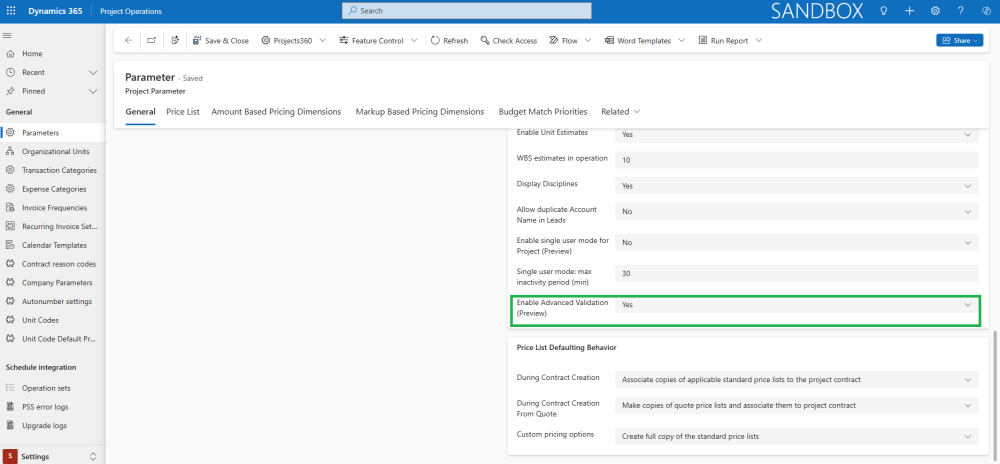 - This is controlled by the “Enable Advanced Validation” parameter. When set to “Yes,” it allows users to receive alerts if the project structure in the Fee Estimator is incomplete.