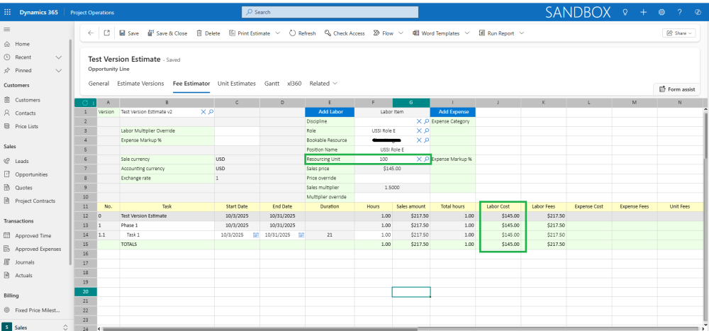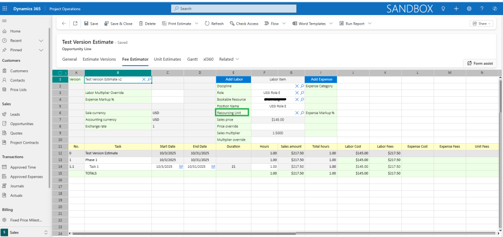 | Unit Fees | The Unit Fees field is read-only and appears when the “Enable Unit Estimates’ parameter is enabled. It reflects the total sales amount from all related Unit Estimates of the selected Estimate Version. |