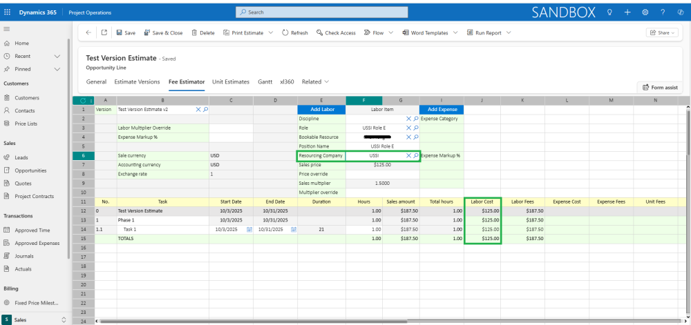 - Changing or selecting a resourcing company or unit in labor items will recalculate the cost prices to the respective records in the spreadsheet.