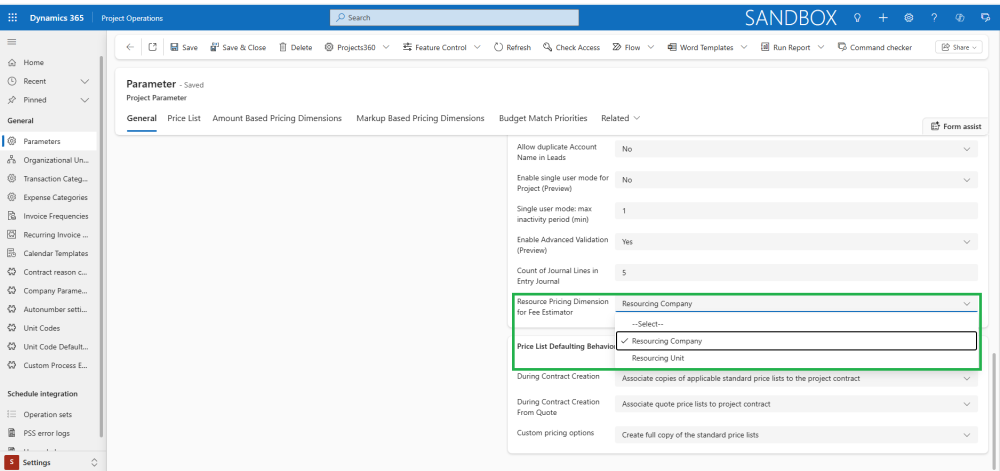 This enhancement enables cost price calculation in the fee estimator (xl360 template) to use ‘Resourcing Company’ or ‘Resourcing Unit’ as pricing dimensions, as defined by project parameters. It lets users to set more precise role cost rates based on the company or unit in the cost price list and the same is reflected in the fee estimator.