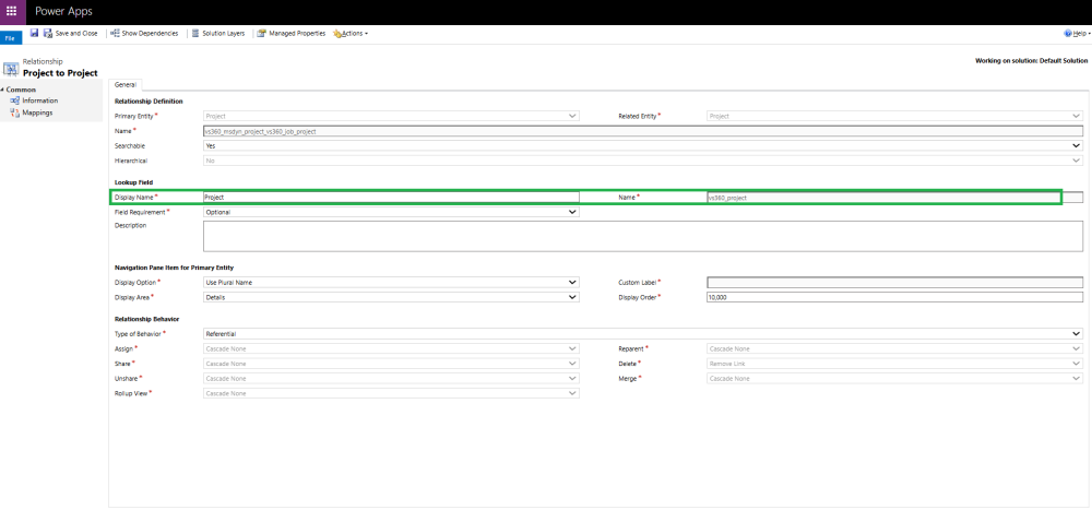 - Set the Display Name (ideally the same as the Primary Entity name), e.g., Project(ProjOps Project).