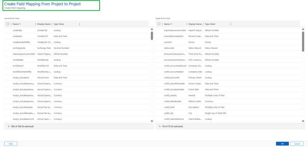 - Select the appropriate source field from Project(ProjOps Project) and the corresponding target field from Project(Marketing Project).