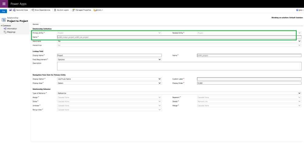- The Name field will reflect the schema name of the Primary Entity, e.g., vs360_project.