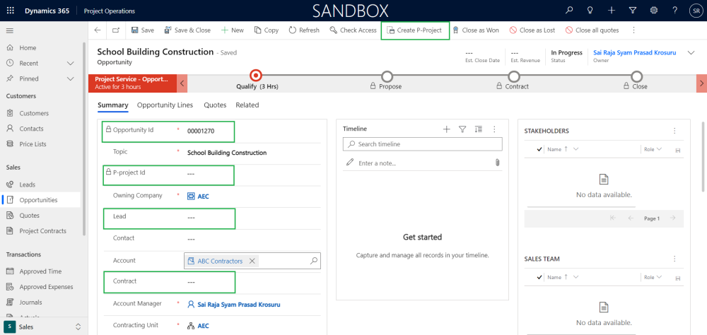 This section details out the opportunity sales process and various steps involved during this process such as opportunity creation, P-project creation, adding opportunity lines, creation of project draft, auto-creation of quote for project draft, closing the Opportunity/Opportunity lines as ‘Won’ or ‘Lost’.
