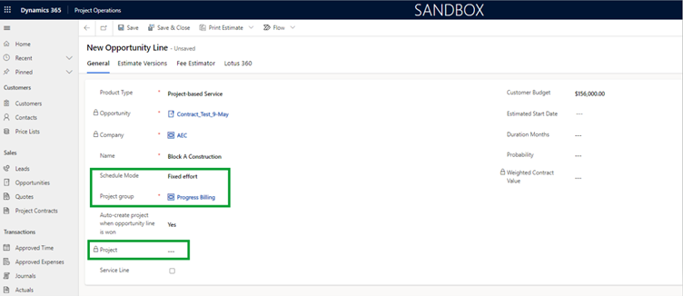 Also, the user can see there are 3 more tabs available under the Opportunity line tab: Estimate Versions, Fee Estimator, and Lotus360.