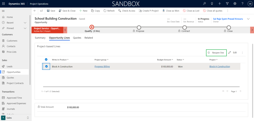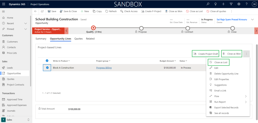 User has been provided with options of creating ‘Project draft’, ‘Auto-create Quote for project draft’, ‘Close as Won’, ‘Close as Lost’ and ‘Reopen line’ at the Opportunity line level.