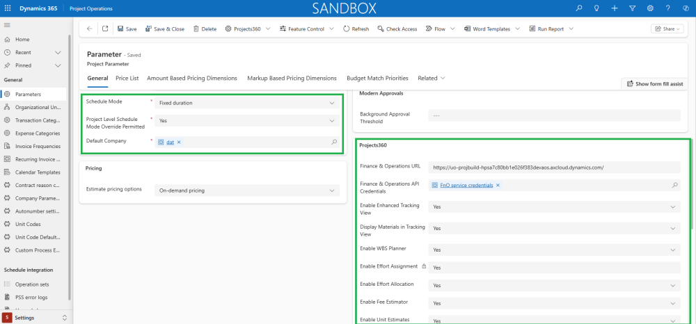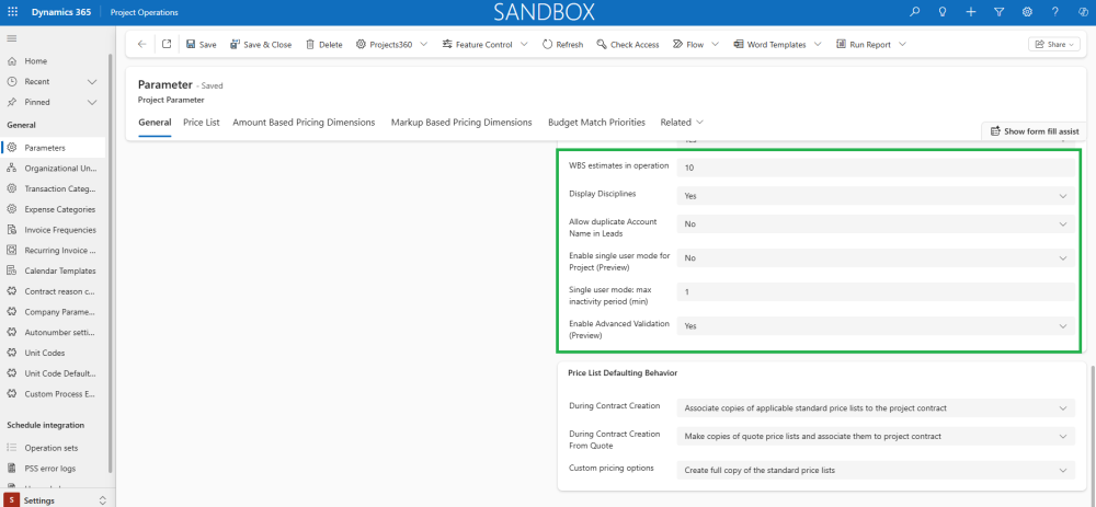 Specific Project 360 parameters have been added to the Project Operations “Project parameters” form. Additionally, some standard parameters must also be configured. Projects360 section can be found in “Project parameters” form where settings related to different areas like Projects, Opportunities, Contracts, etc. can be configured..