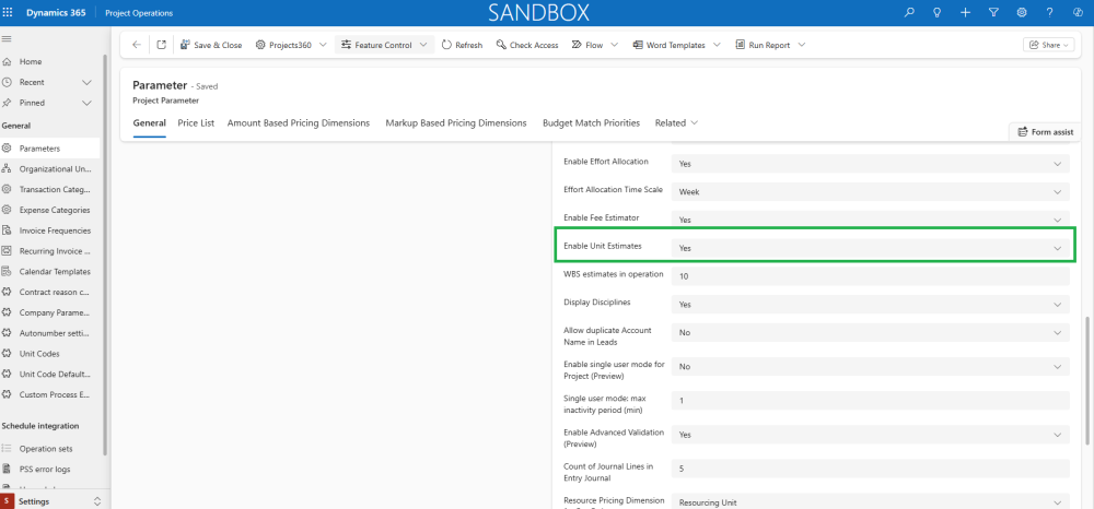 - A Unit Estimates tab is added to the Project form. This tab is visible only when the ‘Activate Unit Estimates’ parameter is set to ‘Yes’.