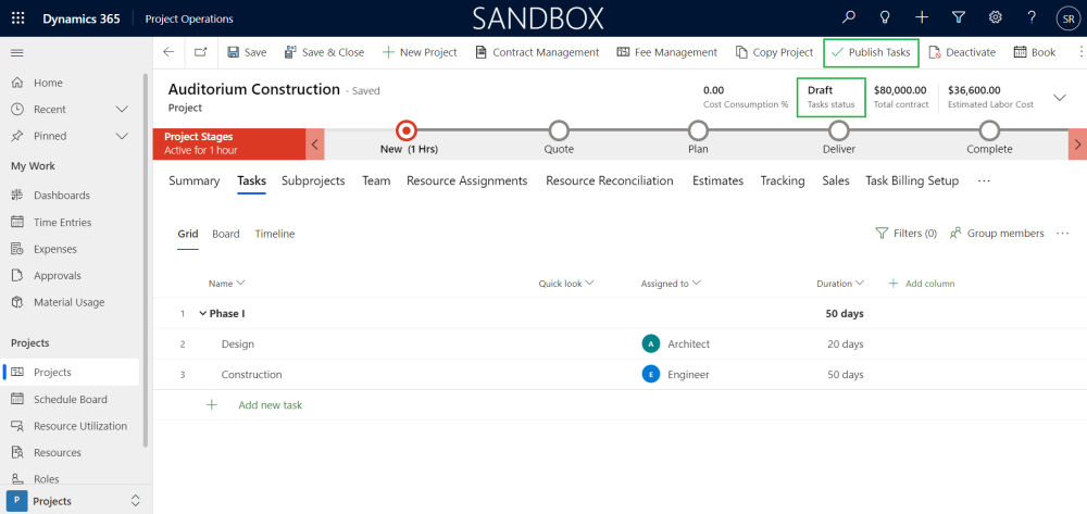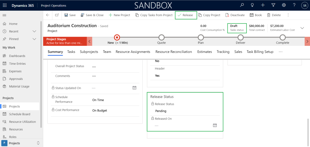 | Note – The project release process includes a validation check to ensure that both “Contract” and “Customer” fields have valid values for all non-internal projects. Additionally, any expense estimates associated with the project are only synchronized to Finance and Operations after the project officially “Releases”. |