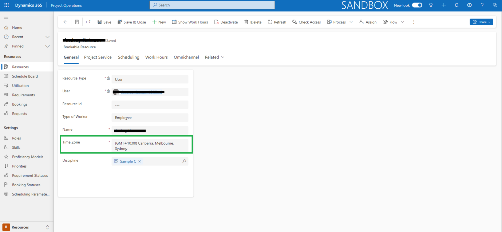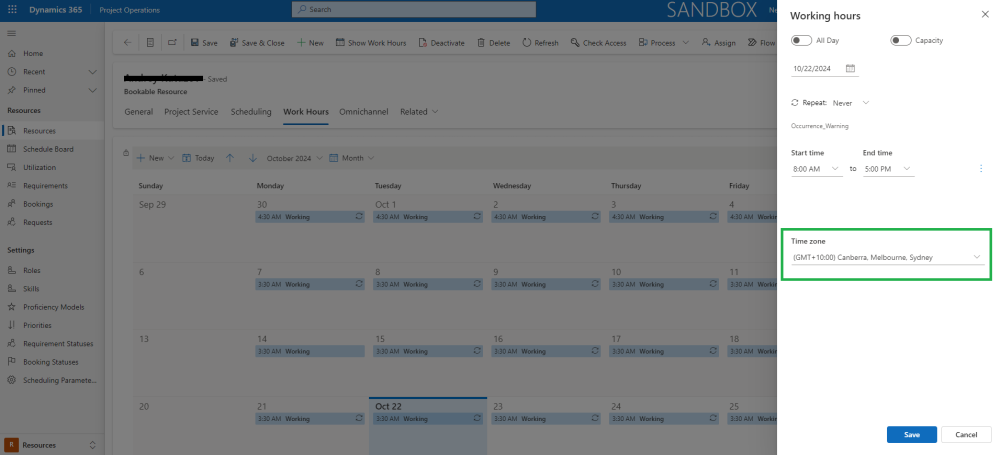 Bookable Resource time zone