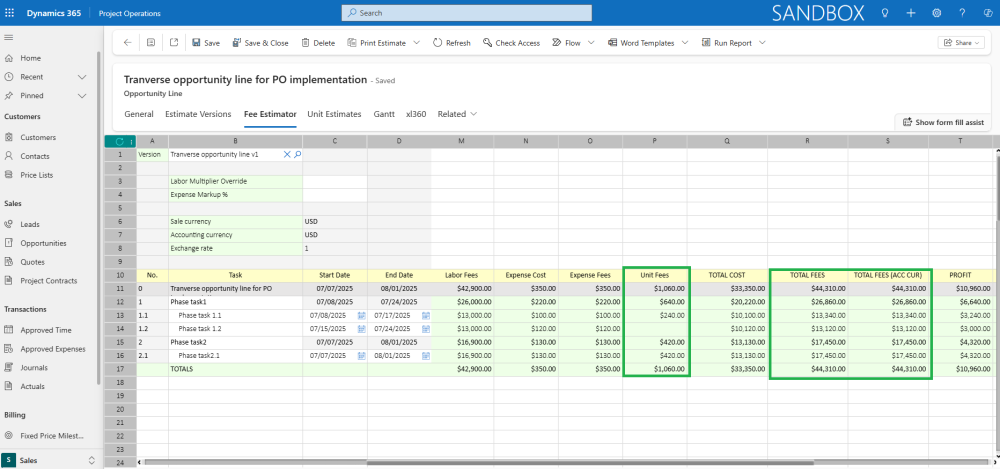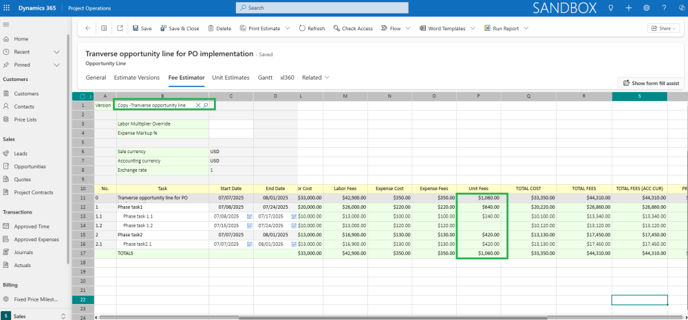 - The Unit Fees column in the Fee Estimator is a read-only field for each task. This value is dynamically calculated based on the selected Estimate Version and represents the aggregated Sales Amount from all related Opportunity Line Unit Estimates records associated with that version.