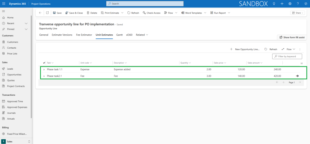 - A new grid for managing unit estimates is available on the Opportunity Line form, accessible under a newly added tab labeled Unit Estimates.