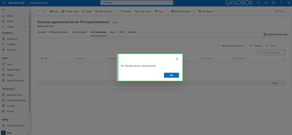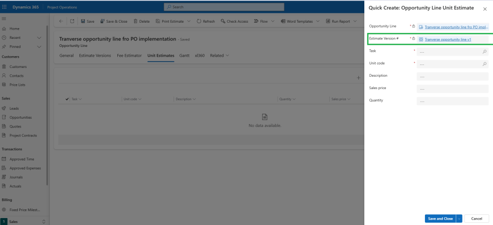 - If no Estimate Versions are available on the Opportunity Line, users will not be able to create Unit Estimates.
