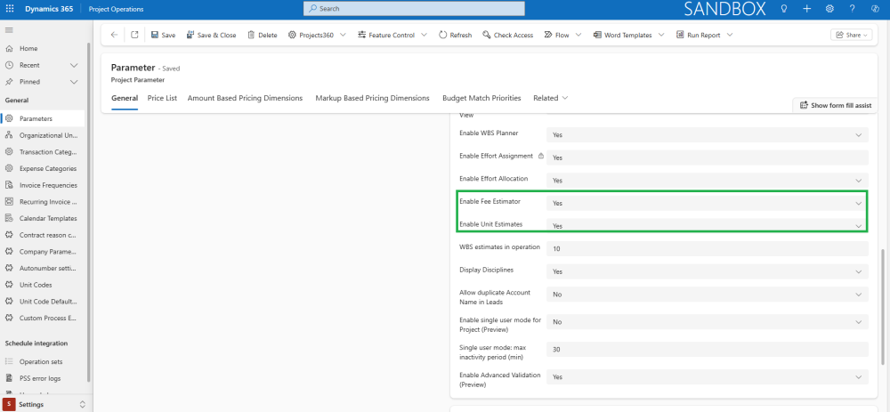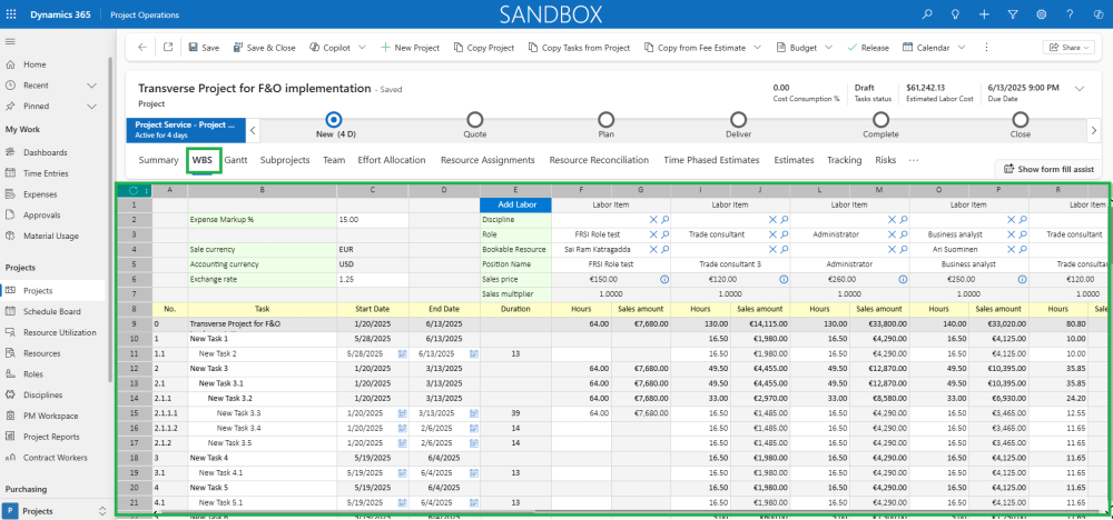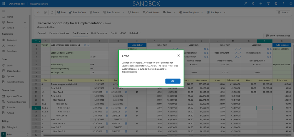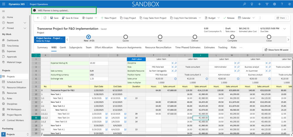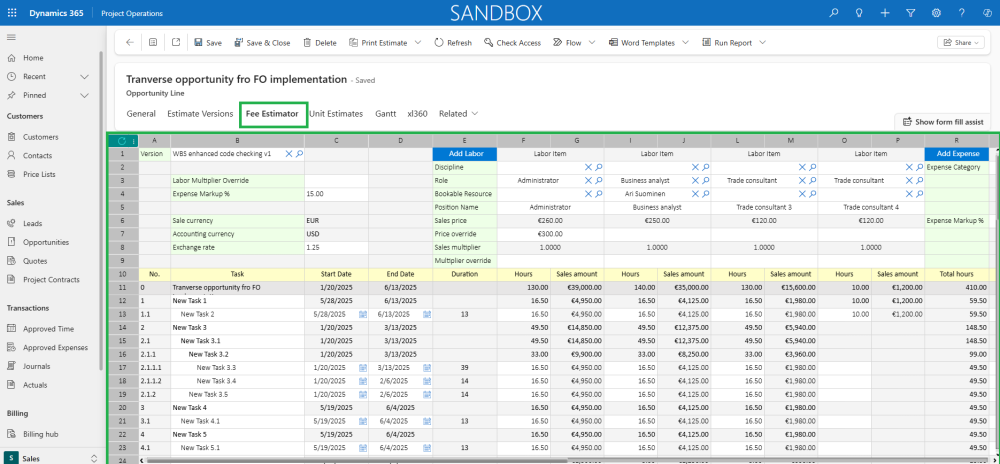As part of this enhancement, the Fee estimator now enforces the same validation rules used in the Work Breakdown Structure (WBS) form in Finance and Operations. This ensures consistency and prevents data discrepancies during integrations.