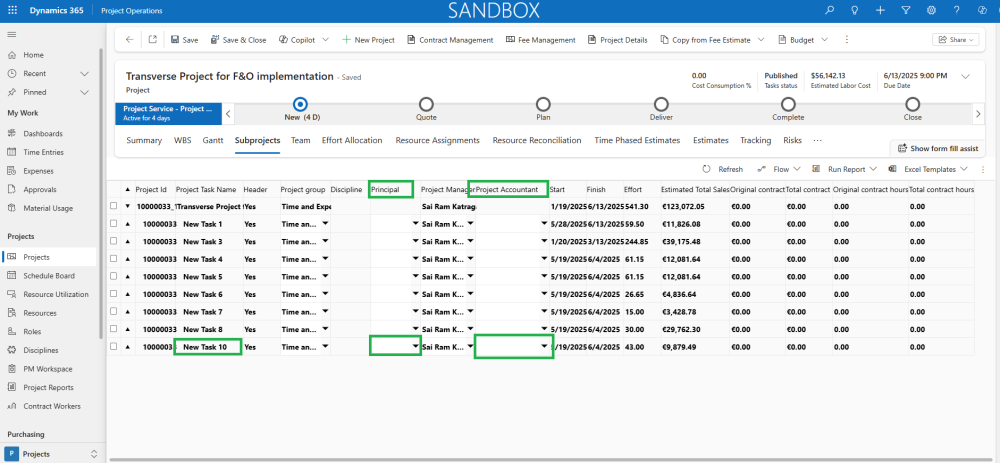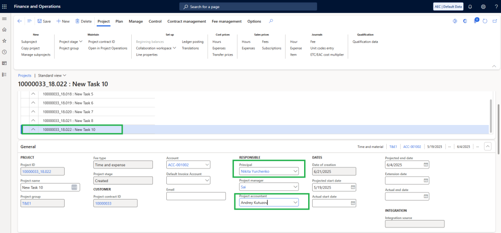 - Previously, when enabling the Activate Principal and Activate Project Accountant parameters in Project Operations, publishing project tasks would clear the corresponding Principal and Project Accountant fields in F&O subprojects.