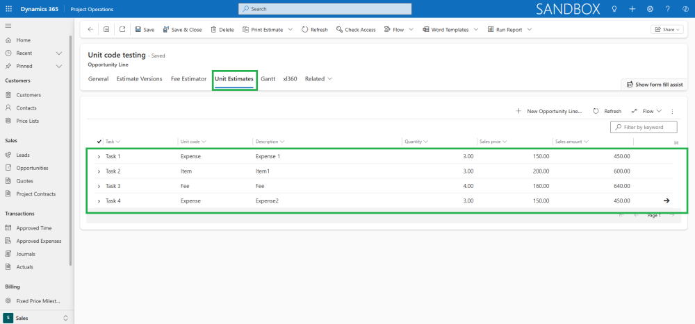 - Unit Estimates are created using a quick create form where users select Task and Unit Codes (synced from Finance and Operations). The description and sales price are auto-filled based on the selected Unit Code and sales currency. Users manually enter the quantity, and the system calculates the sales amount.